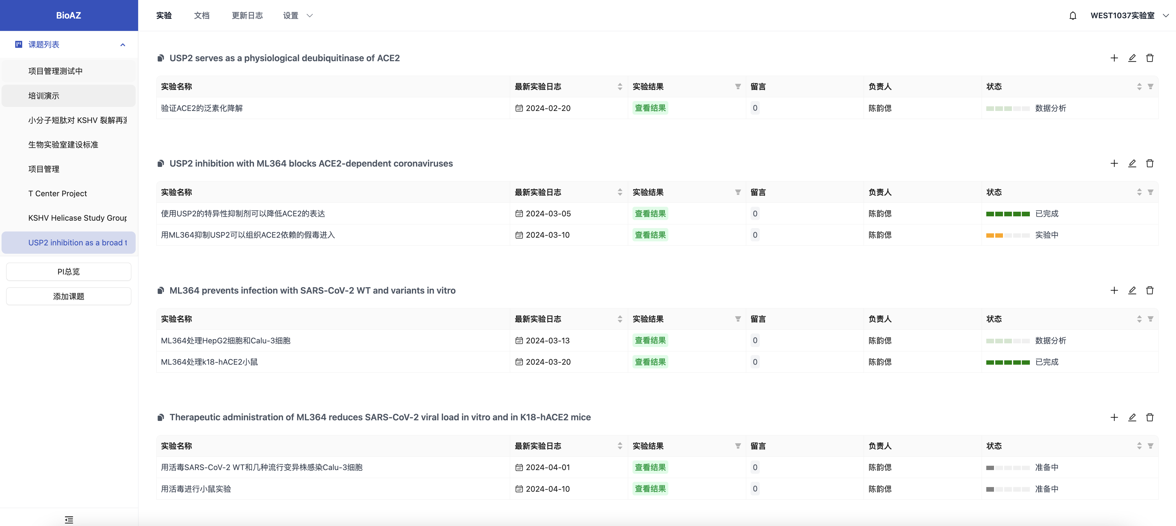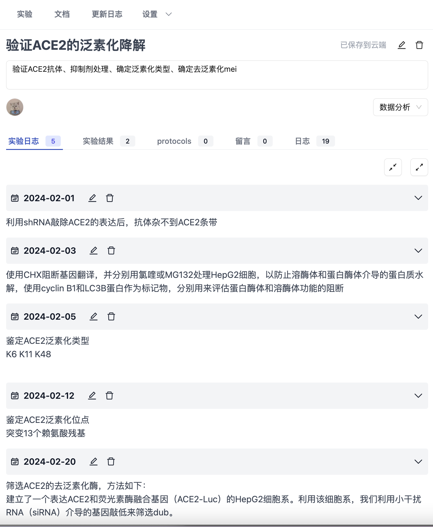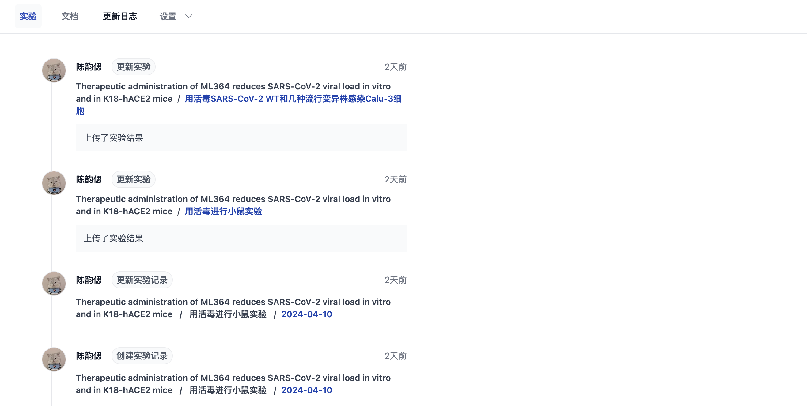 作为PI,还可以随时查看课题的更新记录,包括每一个实验更新、日志更新等都不错过。